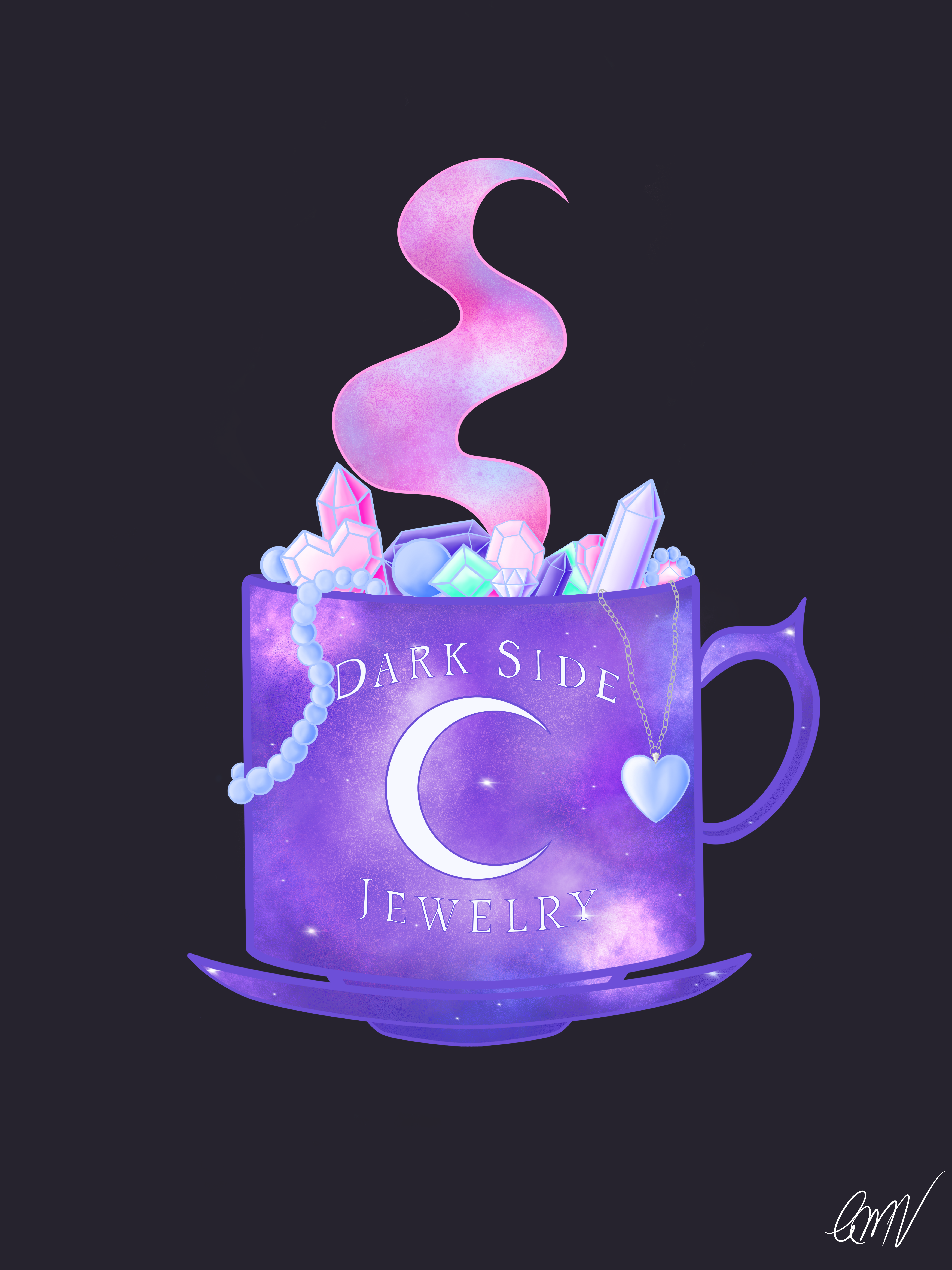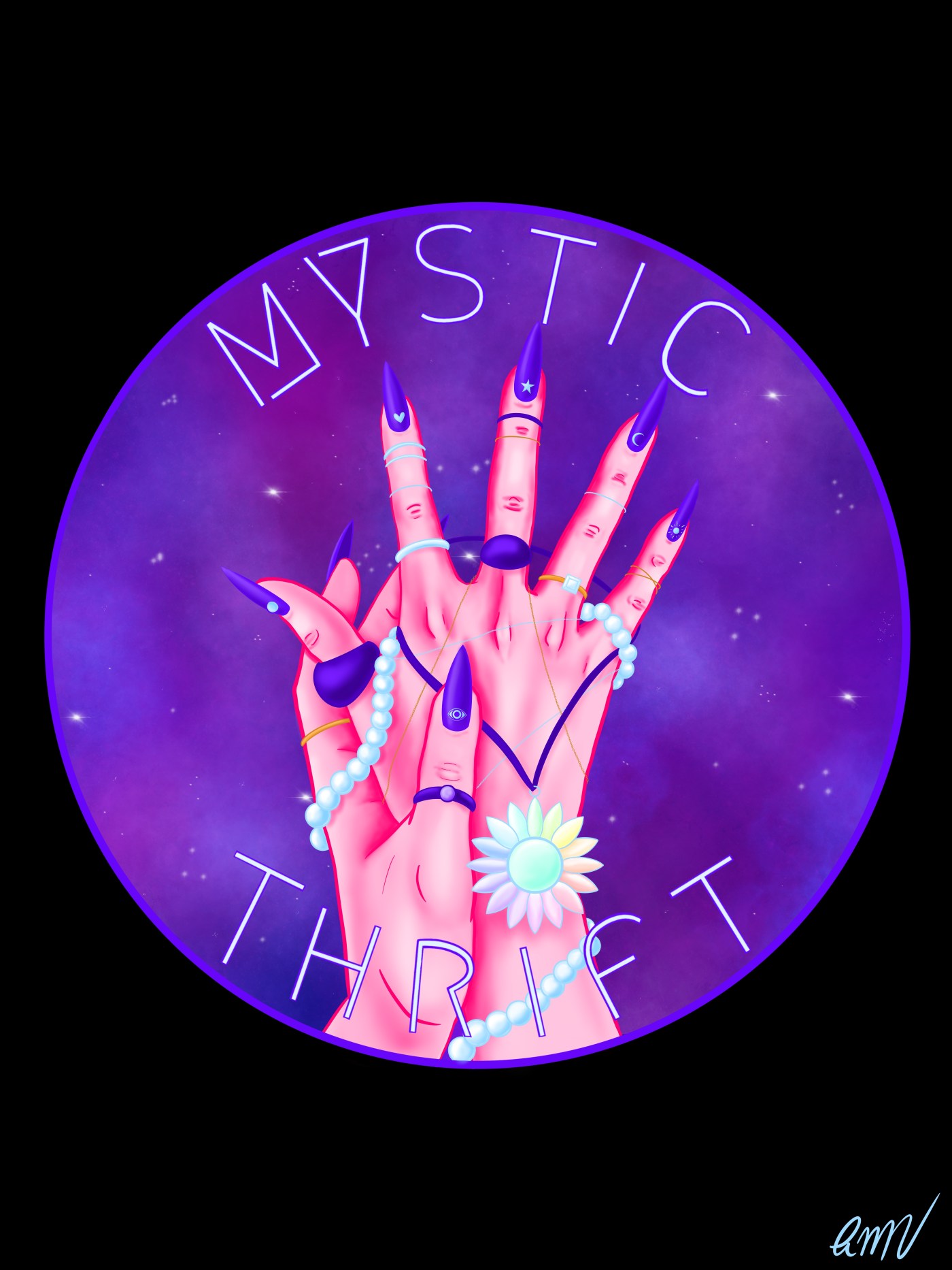a digital drawing of a purple galaxy themed mug and saucer with gems and jewelry in it and the text “dark side jewelry” with a crescent moon on the front. it is set against a black background.a digital drawing of a curvy woman in a two piece purple galaxy themed dress with pink skin, blue hairs and purple makeup. She has a black cat on her shoulders and is holing a crystal ball. The text “blue mystic” is above her in an arch. She is set against a purple background.a digital drawing of two pink hands with long stiletto purple nails and a lot of rings and necklaces draped on them set against a purple galaxy background in a circle. the text “mystic thrift” is also in the circle. the circle is against a solid black background.