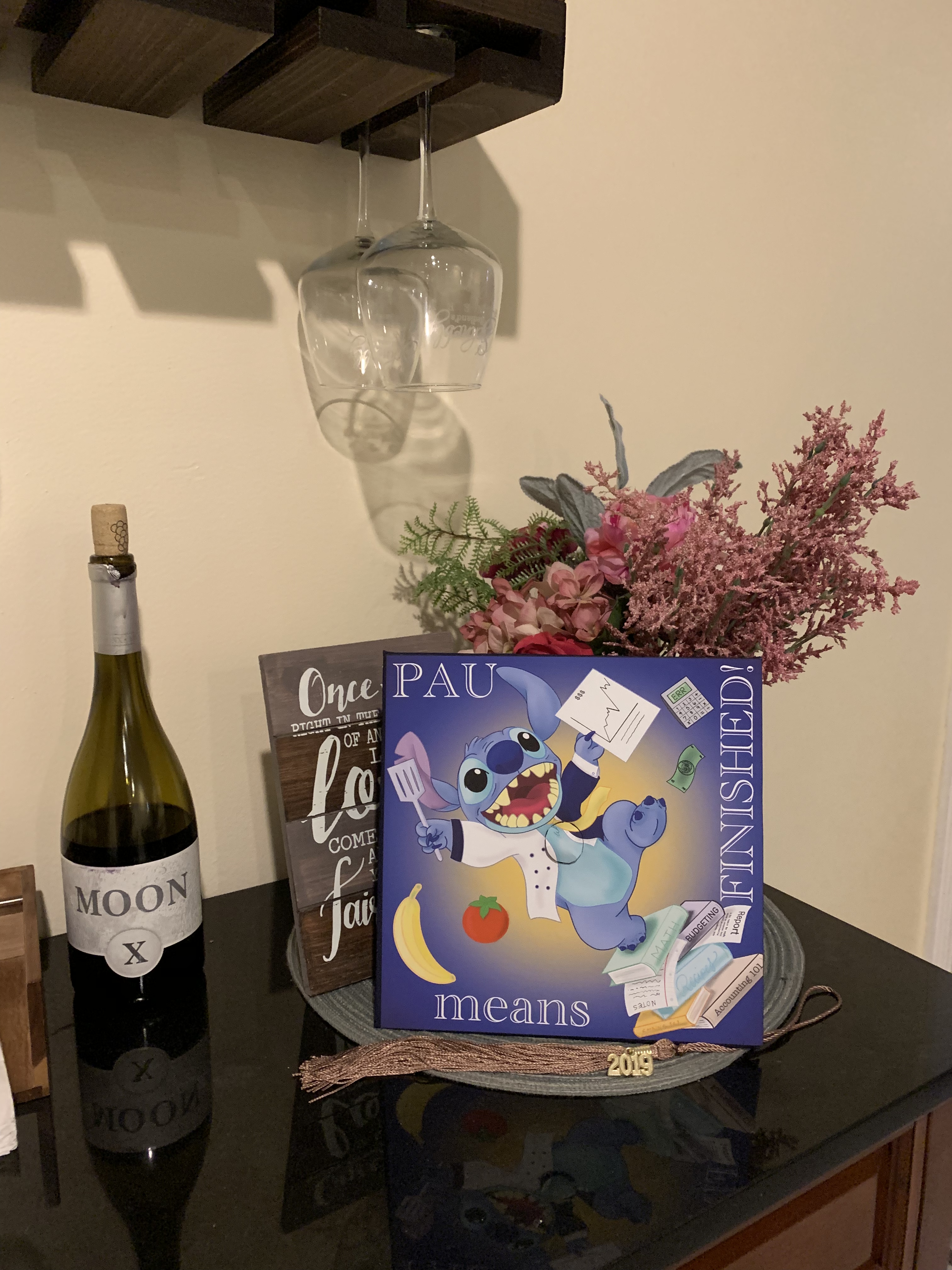 Digital illustration of Stitch the Disney character holding a spatula and sheet of paper with a line graph. He is standing on a pile of books and papers and surrounded by a banana, tomato, dollar, and calculator. The text PAU means FINISHED! is around the border. The background is a circular blue to yellow gradient.Grad Cap on working table.Grad Cap on display next to a wine bottle and flowers on a bar table.